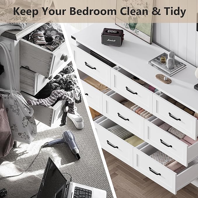 - 【Spacious Storage for Clothes and Accessories】 Featuring nine deep drawers (13.78"D x 18.19"W x 8.03"H), this dresser with drawers keeps clothes, accessories, and daily essentials organized and accessible. Perfect for pairing with a bed frame queen size or a bedroom nightstand, it offers functional storage without sacrificing style.