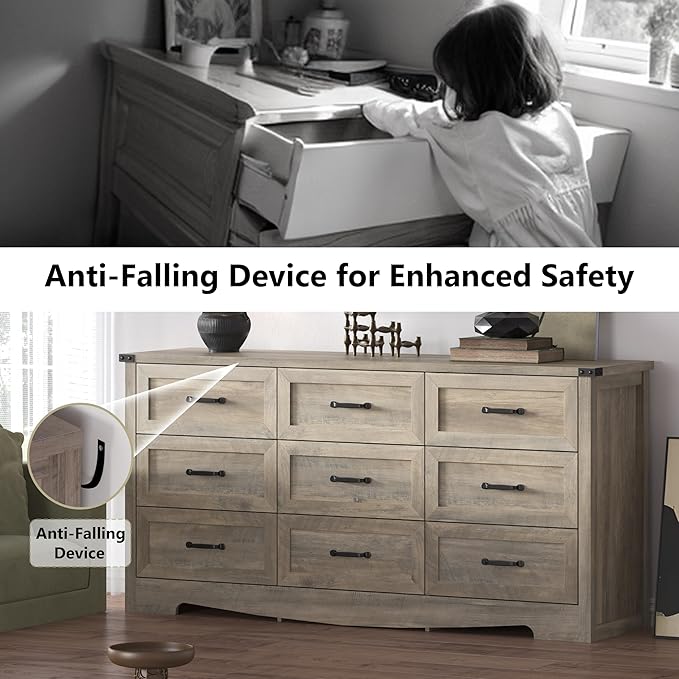 - 【Modern 9 Drawer Dresser for Bedroom & More】 Elevate your bedroom with this modern dresser that combines sleek design and ample storage. Measuring 15.75"D x 59.05"W x 29.52"H, it works perfectly as a dresser for bedroom, TV stand with storage, or closet dresser. The wide top offers space for décor, photos, or essentials, making it a versatile piece for any room.