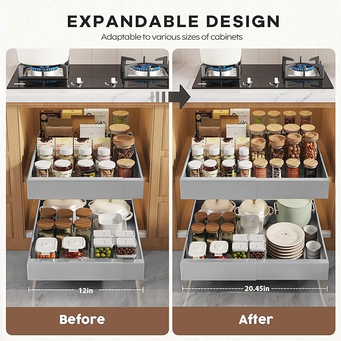 - Customizable Width Expansion: Elevate your kitchen organization with the Seinloes Pull Out Cabinet Organizer, featuring an adjustable width range from 12 inches to 20.45 inches. This customizable design ensures compatibility with any cabinet size, offering tailored storage solutions for pots, pans, bowls, spices, canned goods, and more.