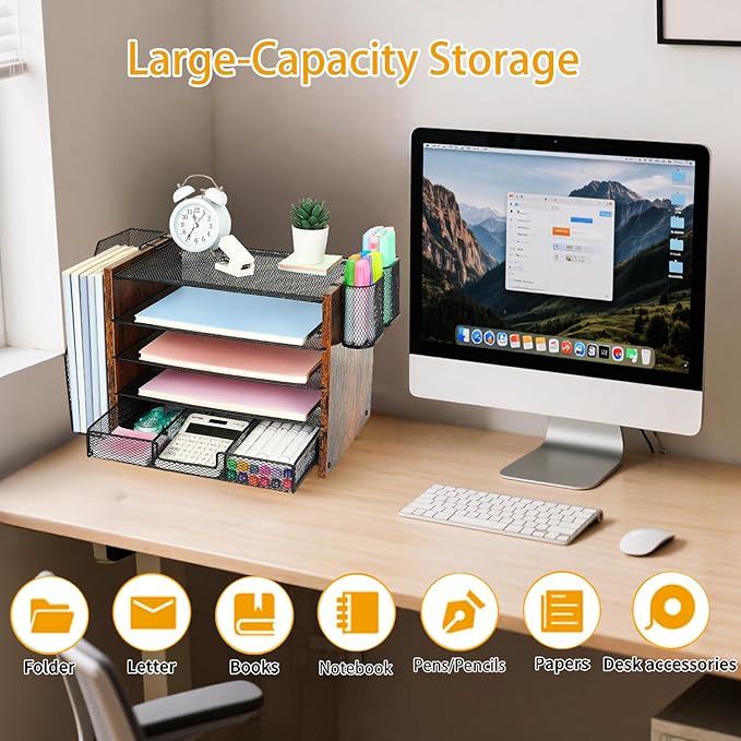 - 【Sturdy, Heavy-Duty Construction】 Built with premium wood and strong steel mesh, this desktop organizer reliably holds up to 44lbs. Features non-slip pads and a durable finish to protect surfaces and ensure long-lasting use