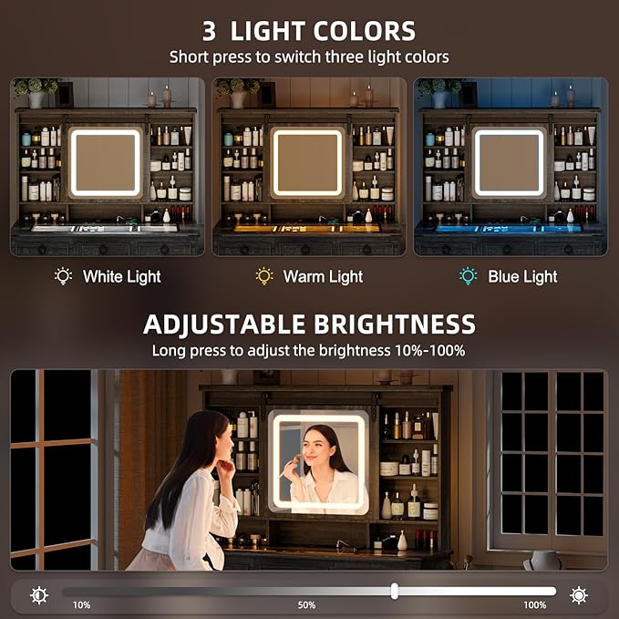 - 【Sliding Mirror with 3 Color Lights】- The Large makeup desk with sliding mirror is equipped with 3 LED lights (cool white, natural light, warm yellow)and the brightness of each color of light can be adjusted to meet your needs.In addition, you can freely slide the mirror to your favorite side which is convenient for your makeup