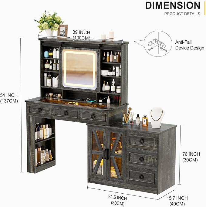 - 【Powerful Storage Capacity】- Farmhouse Vanity desk with 6 drawers ,10 open shelves,jewelry storage space,2-tier storage racks&side adjustable cabinet storing all of your cosmetics and jewelry.Besides,vanity has a transparent glass desktop which is making it easy to quickly find what you need