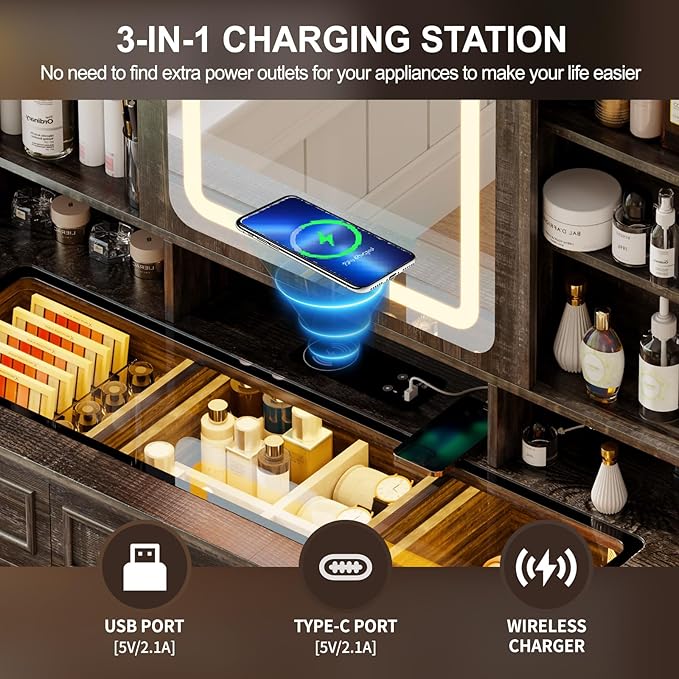 - 【Charging Station&Human body senor】- This makeup vanity comes with 1 x USB, 1 x Type-C port, and wireless charger station, providing great convenience for charging your phone. Besides, When you approach the vanity desk,it will light up and automatically turn off when you leave