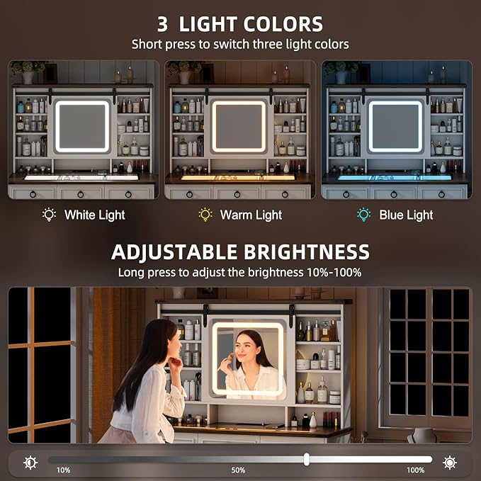 - 【Sliding Mirror with 3 Color Lights】- The Large makeup desk with sliding mirror is equipped with 3 LED lights (cool white, natural light, warm yellow)and the brightness of each color of light can be adjusted to meet your needs.In addition, you can freely slide the mirror to your favorite side which is convenient for your makeup