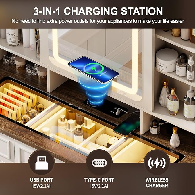 - 【Charging Station&Human body senor】- This makeup vanity comes with 1 x USB, 1 x Type-C port, and wireless charger station, providing great convenience for charging your phone. Besides, When you approach the vanity desk,it will light up and automatically turn off when you leave