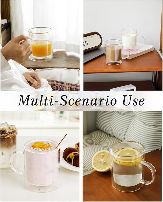 - ☕EASY TO HOLD - The coffee glasses are lightweight, the handles are a perfect size, and do not cause discomfort to hold. It is very easy to use for enjoying Latte, Cappuccino, Espresso, tea, beer, juice, milk, and other hot or cold beverages.