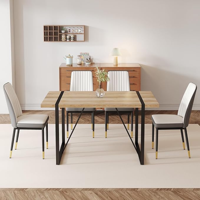 - Artistry of Industrial Design: The clever fusion of unique MDF material and metal frame brings forth a distinctive industrial style, elevating your space to a higher artistic level. Paired with leather chairs, this dining table skillfully combines modern design with classic comfort, bringing a touch of fashion to your dining area.