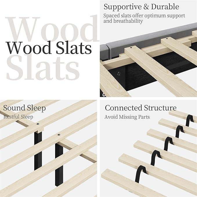 - Sturdy Wood Construction: Interior solid wood framework and robust support feet, 12 pieces of durable wooden slats, and a dense foam-padding border increase the comfort and durability of this queen bed frame with wing design. With a maximum weight capacity of 800 lb