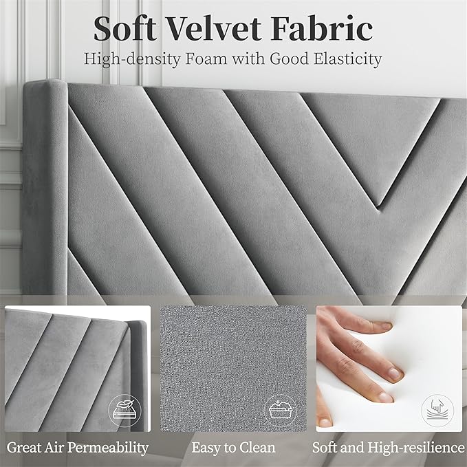 - Wing Side Design: Designed with a wing side on the wide upholstered headboard and skin-friendly velvet fabric, the queen bed frame can be a must-have in any restful retreat. (No Box Spring Needed)