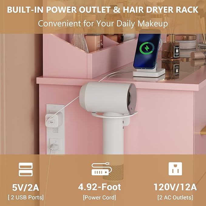- 【Multi-Functional】This vanity desk with mirror and lights that have 3 different color modes: warm yellow, warm white and cold white, you can adjust the light with different lighting conditions, help you create a suitable atmosphere to makeup perfectly. The side of the vanity desk install a hair dryer rack and a power outlet, the power outlet including 2 AC outlets and 2 USB charging ports, very convenient for you to charge phone or beauty power tools such as hair dryer, curling iron. Also, this dressing table set comes with a soft chair, you can sit comfortably and enjoy your makeup.