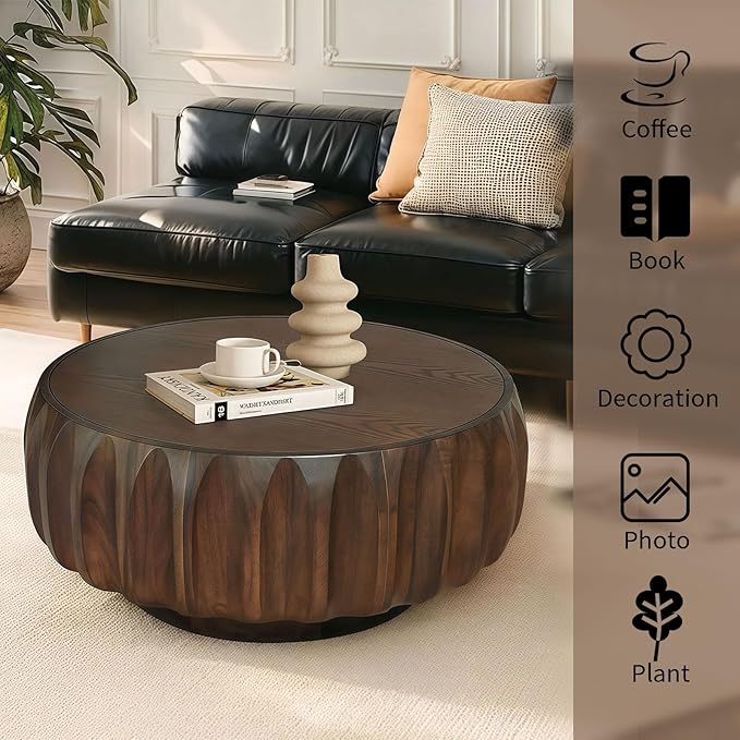 - Stylish and Practical Design: This drum coffee table combines fashion and functionality in its design. It made of solid wood circular top and solid wood recessed sides, enhancing its aesthetic appeal. The spacious surface provides ample room for placing books, drinks, or decorative objects