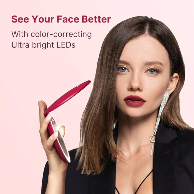Fancii Taylor LED Lighted Travel Makeup Mirror, Rechargeable, 10x /1x Magnifying, Tru-Glow Light Technology, XL Large 5” Wide | Compact Mirror for Purses (Ruby Red)