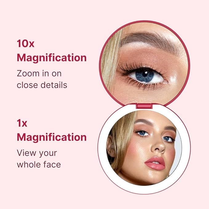 - Double-sided magnification (1x and 10x) so you can apply a full face of makeup, do a quick touch-up on the go, or focus on a detailed task like tweezing or inserting contact lenses