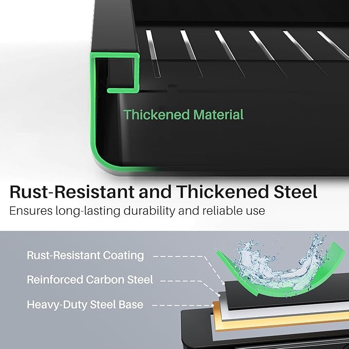- HEAVY-DUTY GAUGE PLATE: The pull-out cabinet organizer made of heavy-duty metal with an extra smooth sliding system to accommodate a large number of pots and pans, placing glides beneath the drawers, and not on the sides, maximizes every inch of your valuable cabinet space while providing a sleek and seamless look.