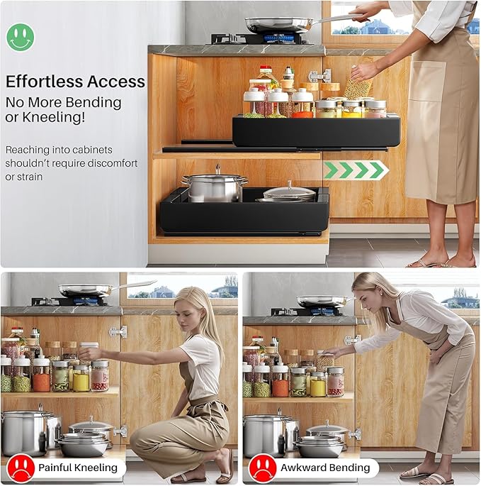 - SLIDE OUT CABINET ORGANIZER: Organizing your cabinet space just got easier with the slide out cabinet organizer, you can make the most of cabinet space and easily access all your pots, pans, small kitchen appliances, cleaning products, canned goods, and other items.
