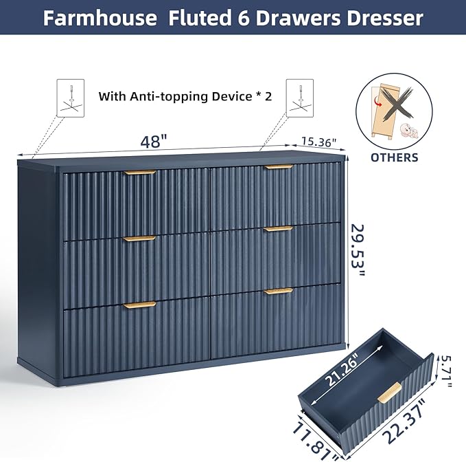 - [Ample Storage Space] Our big 6 drawer dresser measures 15.4"D x 48"W x 29.6"H. The farmhouse wooden dresser comes with six deep drawers,which greatly increase the storage space. You can easily sort your clothes,socks,sheets,pillows, blankets and so on at home. The spacious tabletop is a great choice for displaying photo frames and art decorations.