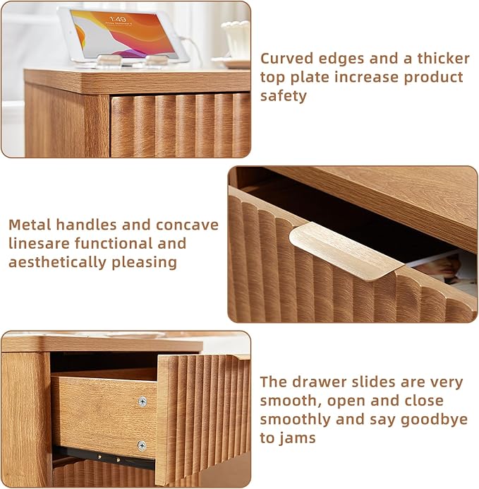 - [LEYAOYAO Versatile Farmhouse Nightstand] Our Fluted bedside table boasts a minimalist curve profile and a drawer with a unique waveform panel, which is a perfect blend of modern aesthetics and functional design. The smooth curved edges make your bedroom exude elegance! This night stand can be used not only as a bed side table but also as a living room end table. Add a strong rustic colour to your bedroom and living room.