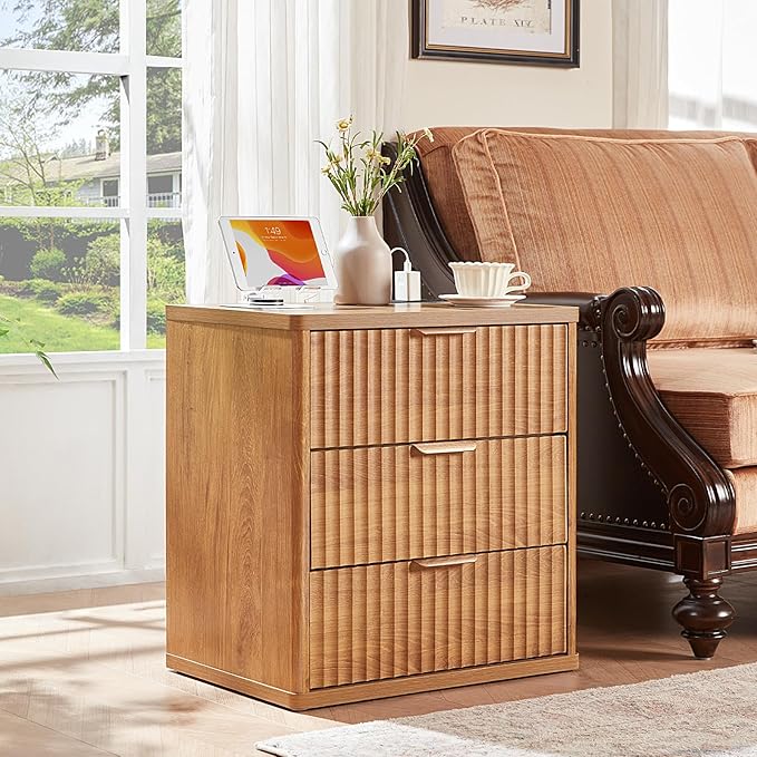 LEYAOYAO 23" Wide Fluted Night Stand with Charging Station, 3 Drawers Large End Table with Storage, Brown Nightstand Wood Bedside Tables, Farmhouse Cabinet Dresser for Bedroom, Living Room,Closet