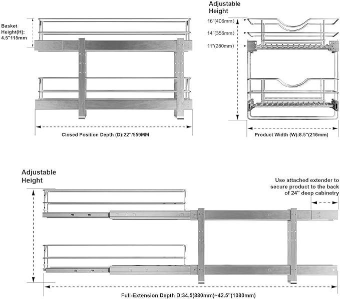 - Slide Out Kitchen Drawer Organizers: The size of the pull out organizer is 8½"W x 22" D; make sure your cabinet opening is 8½" or 8.5 inches or above. Double check your cabinet size before opening.