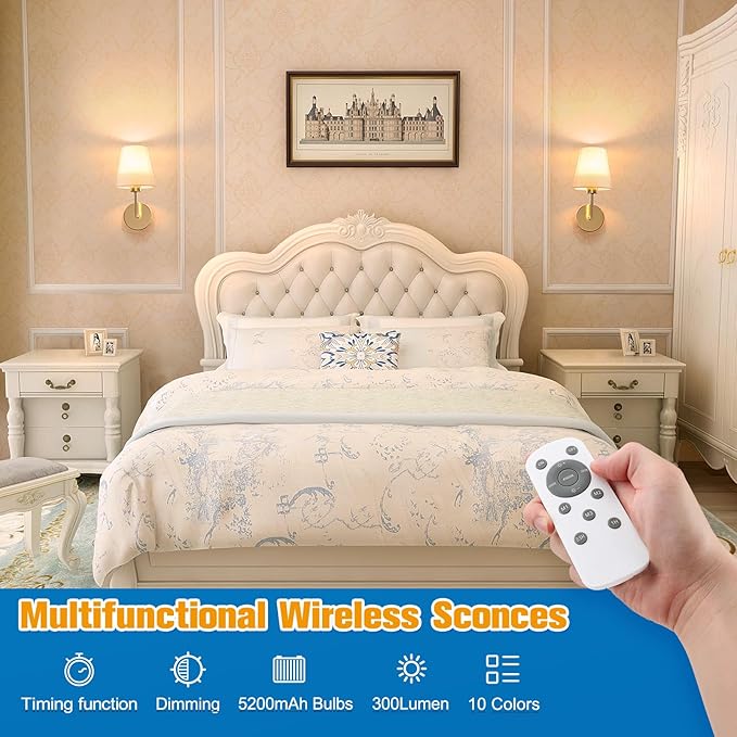 - 【Remote Control & Easy operations】Wireless sconces set of 2 take full control of your lighting experience with the included remote. Easily customize brightness levels and light effects from the comfort of your couch or bed. With just a press of a button, you can create the perfect ambiance for any occasion, whether it's movie night or a cozy evening at home.