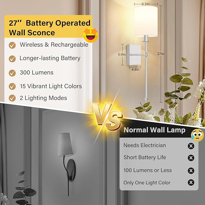 - 【Dimmable & Timer Wall Sconce Set of 2】The battery powered wall lamp offers a dimmable feature with 10 levels of brightness adjustment from 10% to 100%, providing complete control over the illumination level to suit any occasion, whether you're hosting a dinner party or enjoying a cozy night in. Additionally, the lamp features a timer function with preset options of 30, 60, and 120 minutes, ensuring added convenience and energy efficiency by automatically turning off after your desired duration.