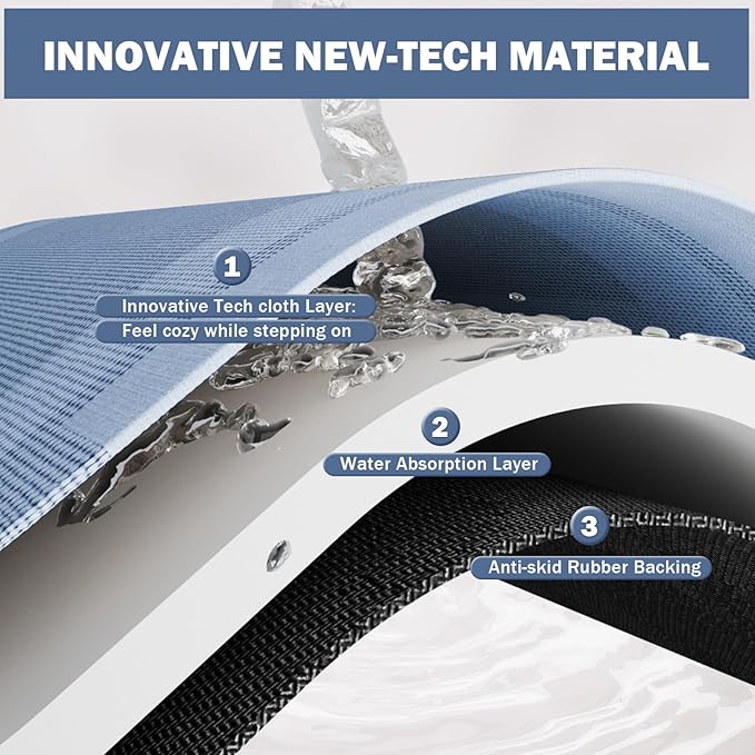 - Super Absorbent & Quick Dry: Super absorbent and quick drying diatomaceous earth bath mat's surface of technological fabric fabric and nano porous absorbent layer can instantly absorb dripping water, while the nano porous absorbent layer allows water to evaporate quickly and fast drying in the natural air, without leaving obvious watermarks or stains, the watermarks will be magically disappeared in a few minutes.