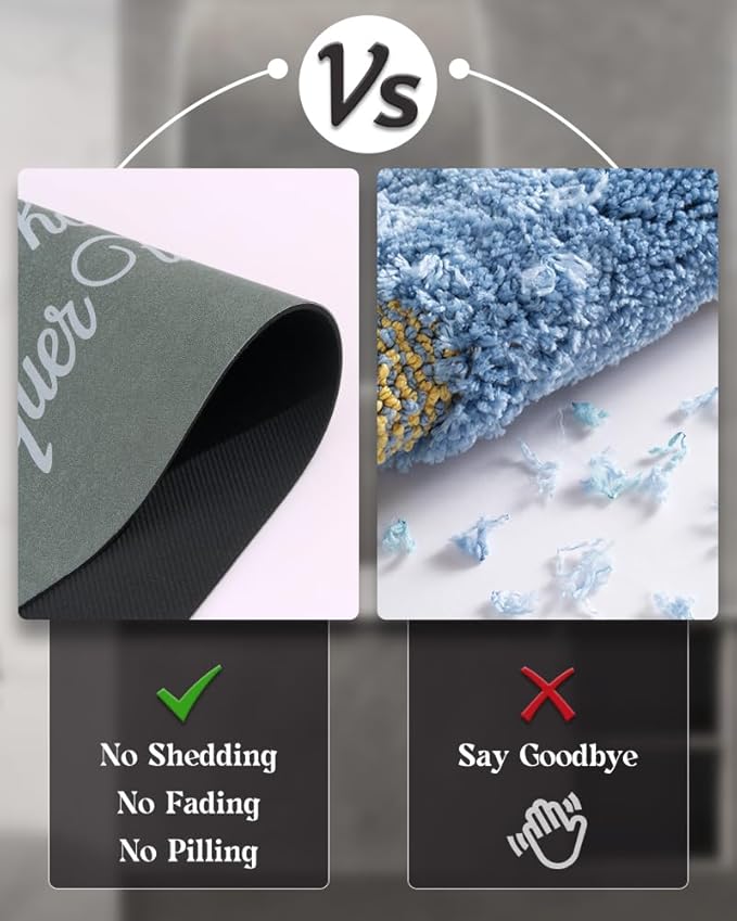 - DURABLE:These bathroom mats are designed with a Faux suede surface. You will never be bothered by fiber dropping or fuzzy pilling problems like traditional chenille bathroom floor mats. Therefore, this bath rug is much more durable without problems caused by fibers, like shedding, fading, wearing, dirt or hair hiding