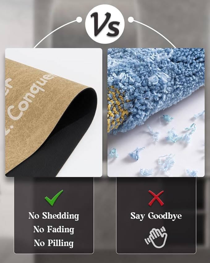 - DURABLE:These bathroom mats are designed with a Faux suede surface. You will never be bothered by fiber dropping or fuzzy pilling problems like traditional chenille bathroom floor mats. Therefore, this bath rug is much more durable without problems caused by fibers, like shedding, fading, wearing, dirt or hair hiding