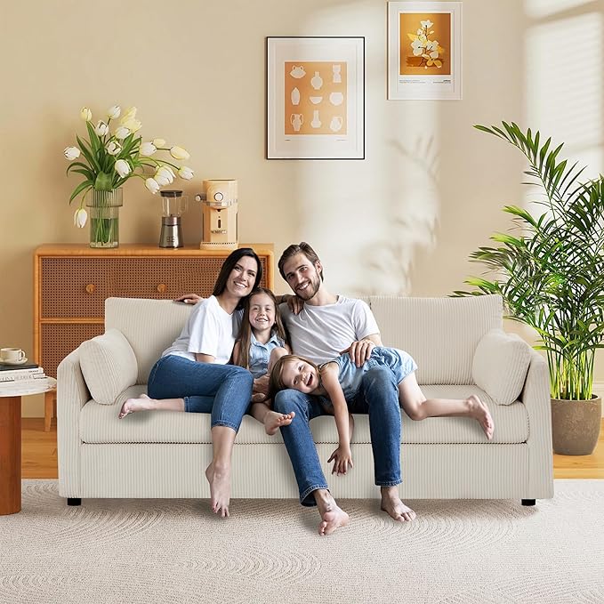 79 inch Sofa for Living Room,Mid Century Modern Couch with Big Pockets, Corduroy Couch with Three Cushions and Solid Wood Frame for Apartment and Small Spaces (Beige, Sofa)