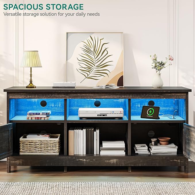 - Power Outlet Included: The TV Stand comes with power outlet, 4 standard plug sockets and 2 USB ports, ideal for charging various electronic devices easily