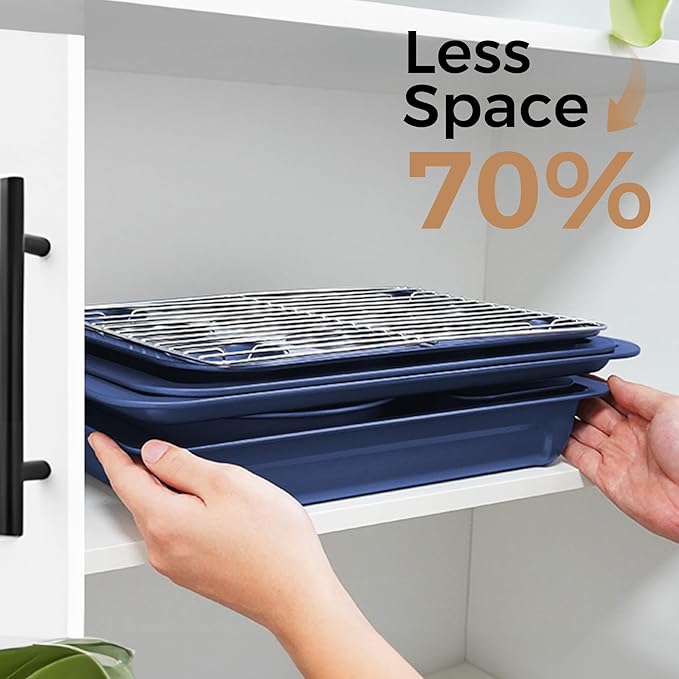 - WIDEN & STACKABLE DESIGN - HONGBAKE baking sets with commercial-grade reinforced wide grips are the perfect combination of ergonomics for better grip and to avoid slipping. All pieces of our baking set are designed to fit neatly into one another, and you'll never have to hunt for missing baking trays again, also saving you valuable space in your kitchen cabinets
