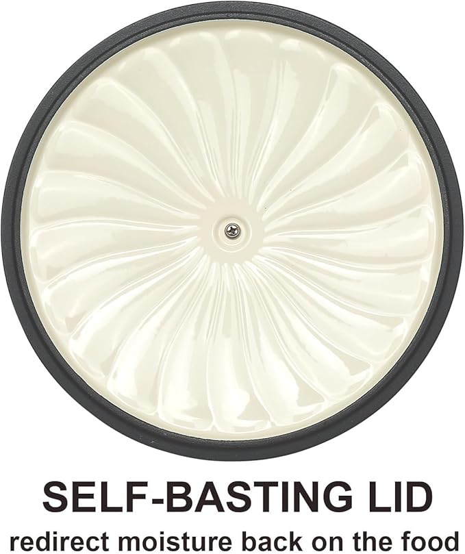 - Closed Heat Cycle: This enamel dutch oven pot is designed with a circular shower lid, the raised design of the lid makes the water vapor circulate in the pot, locks the food's nutrition and moisture, keeps the food's nutrition and moisture