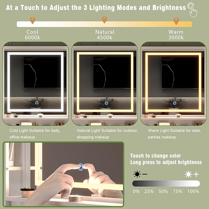 - [ Touch Control LED mirror ] The makeup table with 1 LED mirror.Gently touch the button to adjust 3 color modes(cool, natural, and warm light) , Long press to adjust brightness.You can choose the color temperature and brightness that suits your use