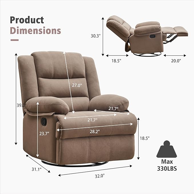 - All-in-One Comfort: Our recliner does it all – rocks, swivels, and reclines up to 160 degrees for the ultimate personalized comfort.