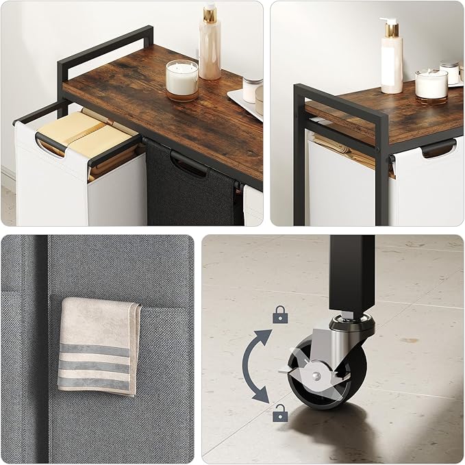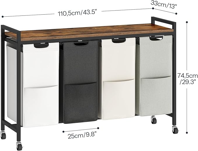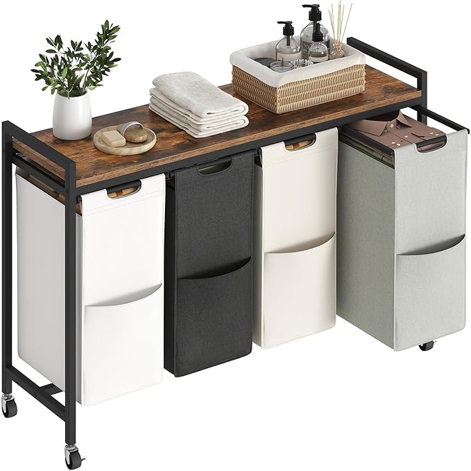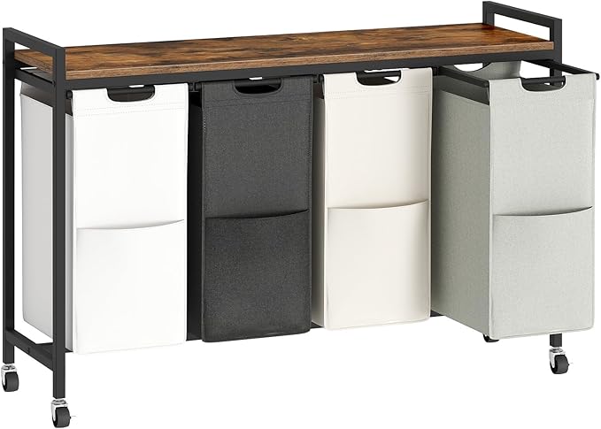 HOOBRO Laundry Sorter 4 Sections, Laundry Hamper with Wheels, 4 × 10.5 Gal (40 L), Rolling Laundry Basket, Pull-Out and Removable Oxford Fabric Bags, Rustic Brown BFE04XY01