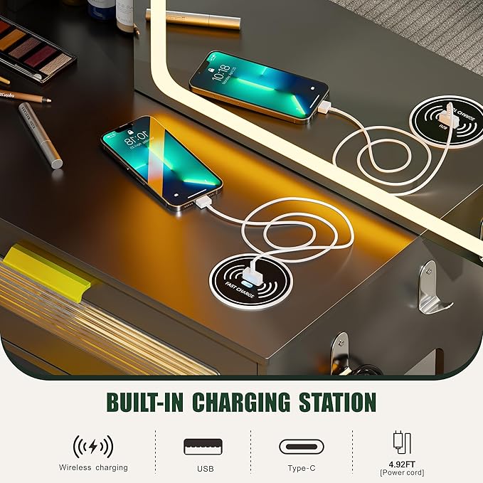 - 【Built-in Charging Station】Make up vanity includes wireless charging, USB charging port and Type-C charging port.Besides,With human body sensing function, the lights will automatically turn on when you approach and turn off when you leave, making your life more intelligence