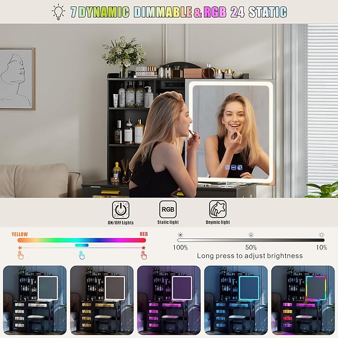 - 【RGB Color Light Dimmable】This vanity desk features 24 static and 7 dynamic RGB modes.You can adjust the multiple colors or brightness according to different scenes and match your different makeup needs