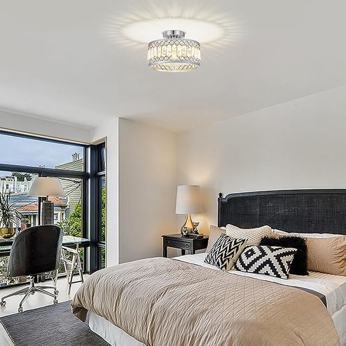 - Contemporary Design: The semi flush mount ceiling light features K9 crystals, which is bright and shiny. When the light is on, the crystals refract light into a dazzling display, scattering elegant patterns across your ceiling. Adding a touch of sophistication to your home