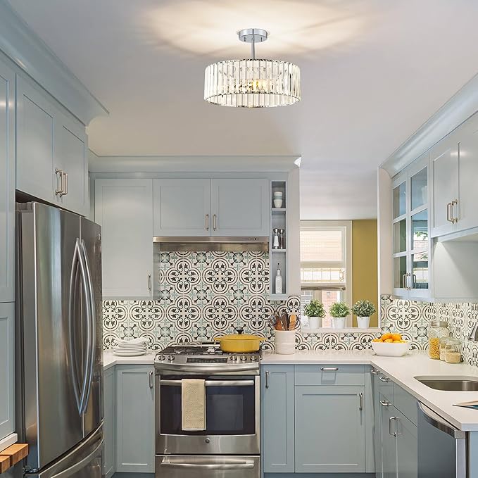 - Contemporary Design: The semi flush mount ceiling light features K9 crystals, which is bright and shiny. When the light is on, the crystals refract light into a dazzling display, scattering elegant patterns across your ceiling. Adding a touch of sophistication to your home