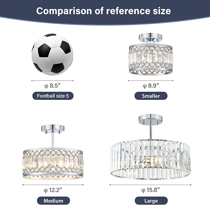- E12 Bulb Base: The crystal ceiling light features three E12 candelabra sockets (60W max per bulb), compatible with LED, CFL, halogen, and incandescent bulbs (not included). This ceiling light fixture measures 15.7 inches wide, 15.7 inches deep, and 11.2 inches high