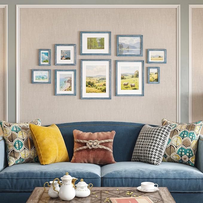 - SOLID WOOD: Made with premium quality materials. Transparent plexiglass to protect against dust and moisture. The wooden frame will be a long-lasting way to showcase your favorite memories. Display your photographs, travel souvenirs, concert programs, awards, certificates, artwork with our rustic blue picture frame.
