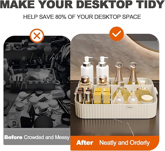 - 1.SOPHISTICATED DESIGN:The cosmetic organizer boasts a 12 compartments design that provides ample space for all your beauty products,cosmetics,office stationery and accessories.The bottom of the makeup organizer countertop is non-slip and can be placed stably.