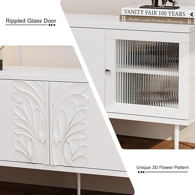 - 【Modern TV Stand】This wood TV stand has a unique design with fluted glass double doors and elegantly 3D flower pattern for a more unique and modern look. Compatible with most room styles, brings an eye-catching feel to your living room, bedroom or dining room.