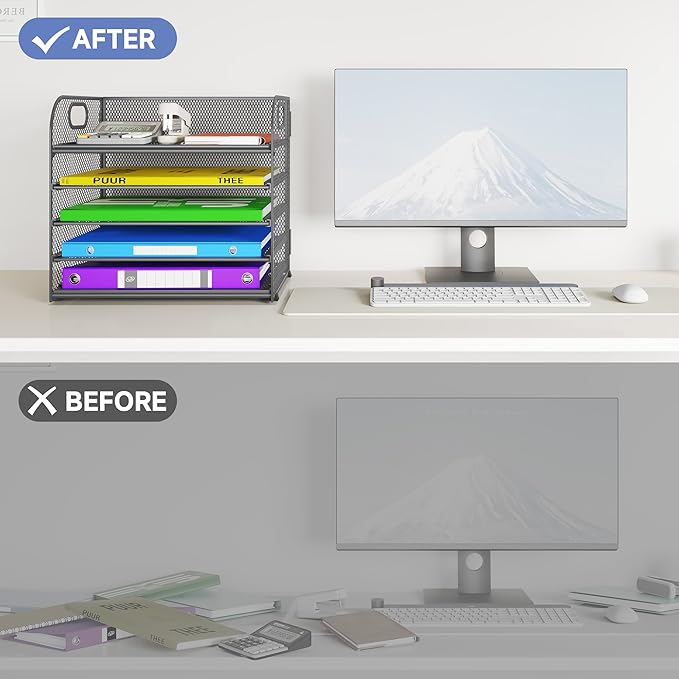 - 【DURABLE CONSTRUCTION】This desk file organizer is crafted from premium metal mesh. Thickened support rods and a sturdy frame ensure that the file organizer won't warp or break when holding a large volume of paper or letters.