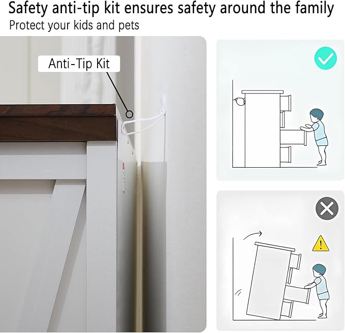- Stability and Durability: The farmhouse dresser is made of high quality MDF, which is scratch resistant and not easy to bend or crack. The floor standing base design enhances the stability of the dresser with an anti-tip device for your peace of mind. The top can hold up to 150lbs and the drawers can hold up to 25lbs. The high-quality finish ensures that the dresser is easy to clean and resistant to daily wear and tear, extending its lifespan