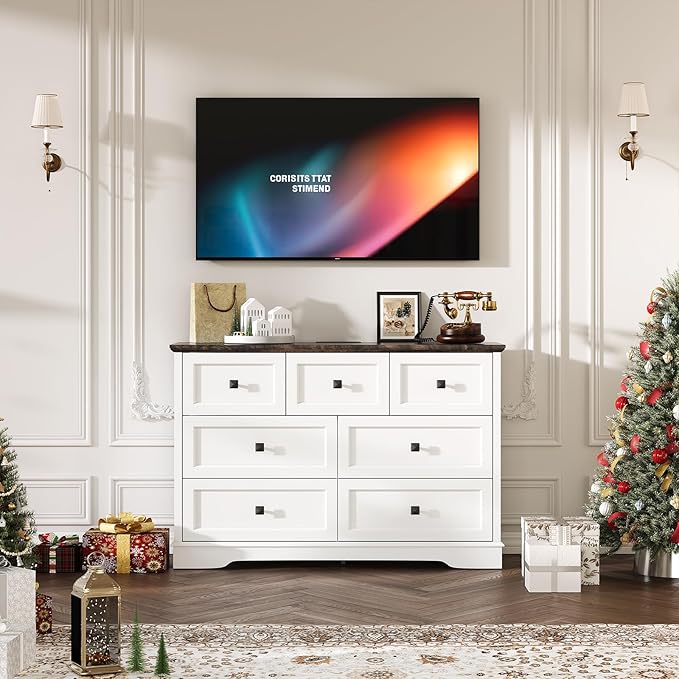 Farmhouse 7 Drawers Dresser for Bedroom with Charging Station, Wide 7 Chest of Drawers, White Wood Dressers Organizer for Closet, Modern Storage Organizer Cabinet for Living Room,Hallway & Entryway