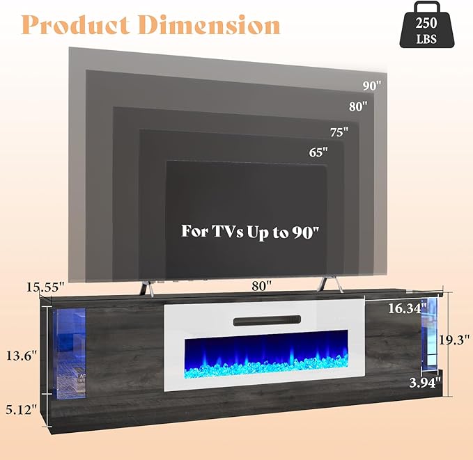 - [Dimensions & Specifications] TV Stand: 80"Wx19.3"Hx15.6"D, Electric Fireplace: 40"Wx13.7"Hx4.9"D. TV stand fits TVs up to 90" & 250lbs. Clear & detailed assembly instructions included, total includes 2 cartons & possibly delivered on separate days