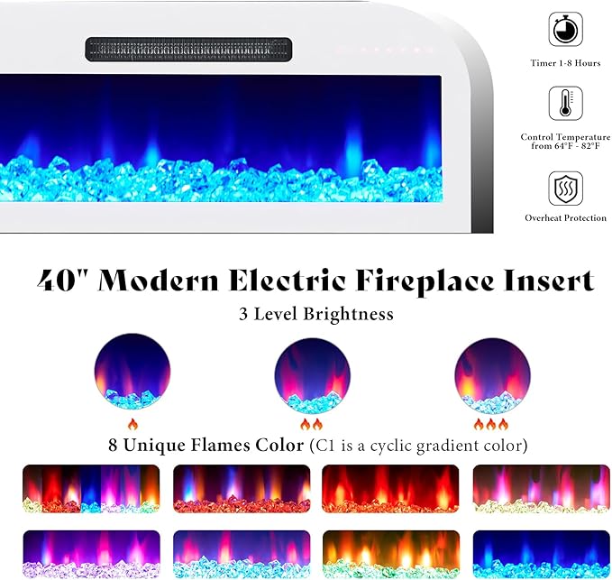 - [Large Multifunction Fireplace] CSA-certified fireplace contains 8 realistic flame colors & 8 crystal colors, 3 levels of dimmer, temperature control, and timer setting. 1400W power heat room size up to 400 sq. ft. can work with or without heat