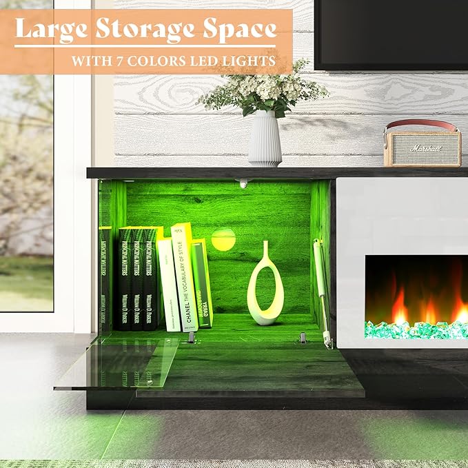 - [LED Lights TV Console] Includes a 7-color LED kit, which synchronizes with the fireplace crystal color and offers a total of 64 color combinations, transparent corner glass decor on both sides provides a home theater-like visual experience