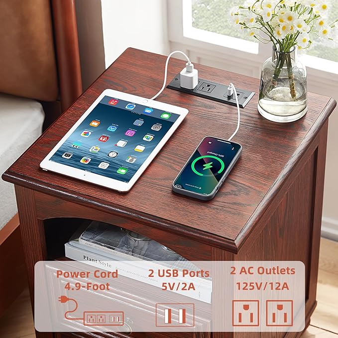 - Farmhouse Nightstand With Charging Function: Equipped with 2 outlets and 2 USB ports, this night stand supports simultaneous charging of multiple devices such as cell phones. Say goodbye to desktop cable clutter. Featuring a 1.2-inch padded tabletop, (overall dimensions: 18“ L x 18” W x 24” H), this nightstand adds practicality and modernity to your space, whether it's used as a End table or a living room side table.